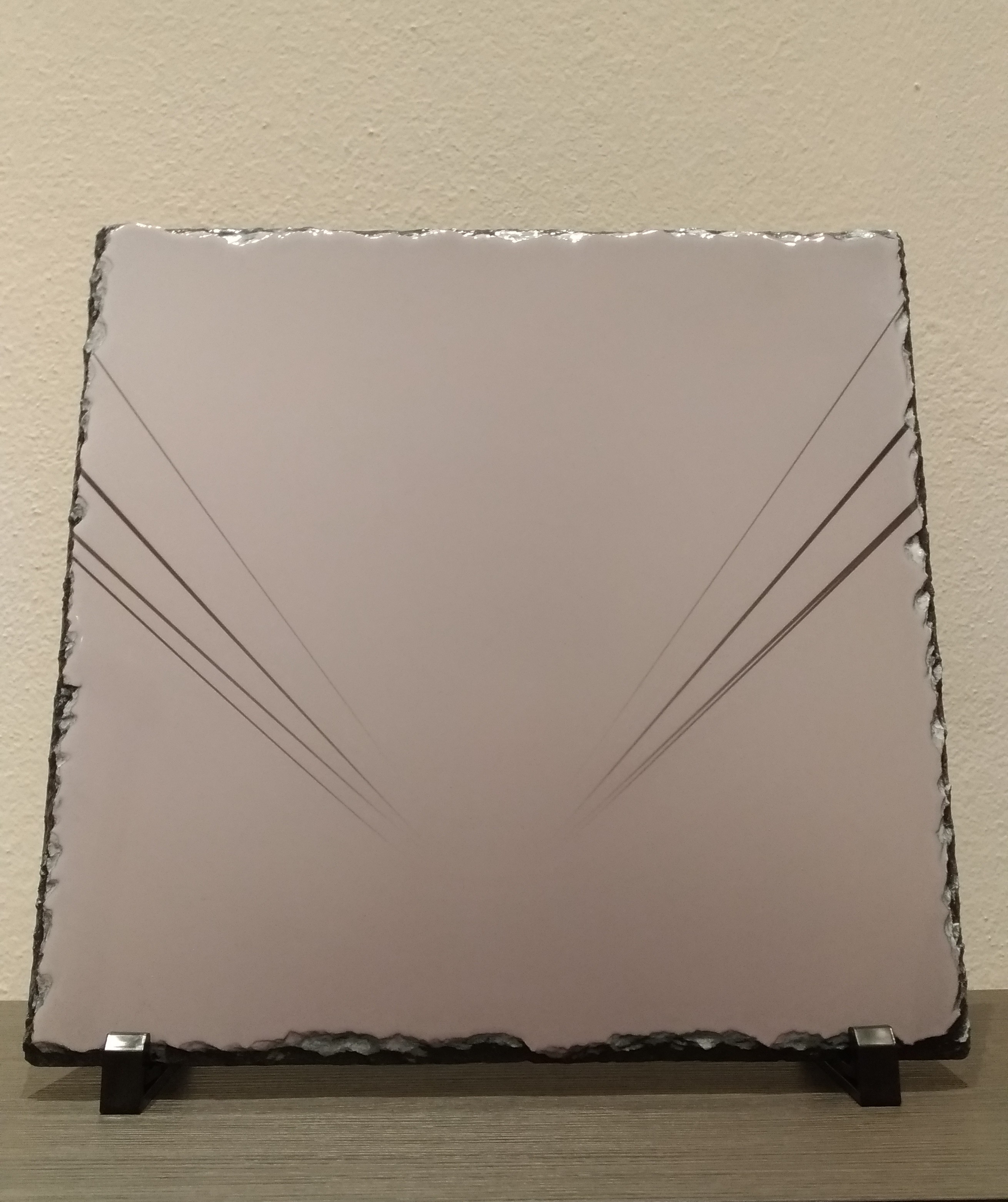 Le mie fotografie dunque vengono stampate su pietra ardesia; voglio che abbiano un "peso", voglio che ci sia la possibilità di portarsi via un pezzo della stanza.