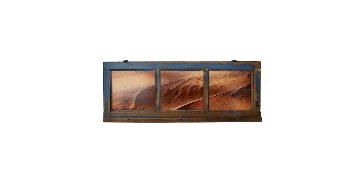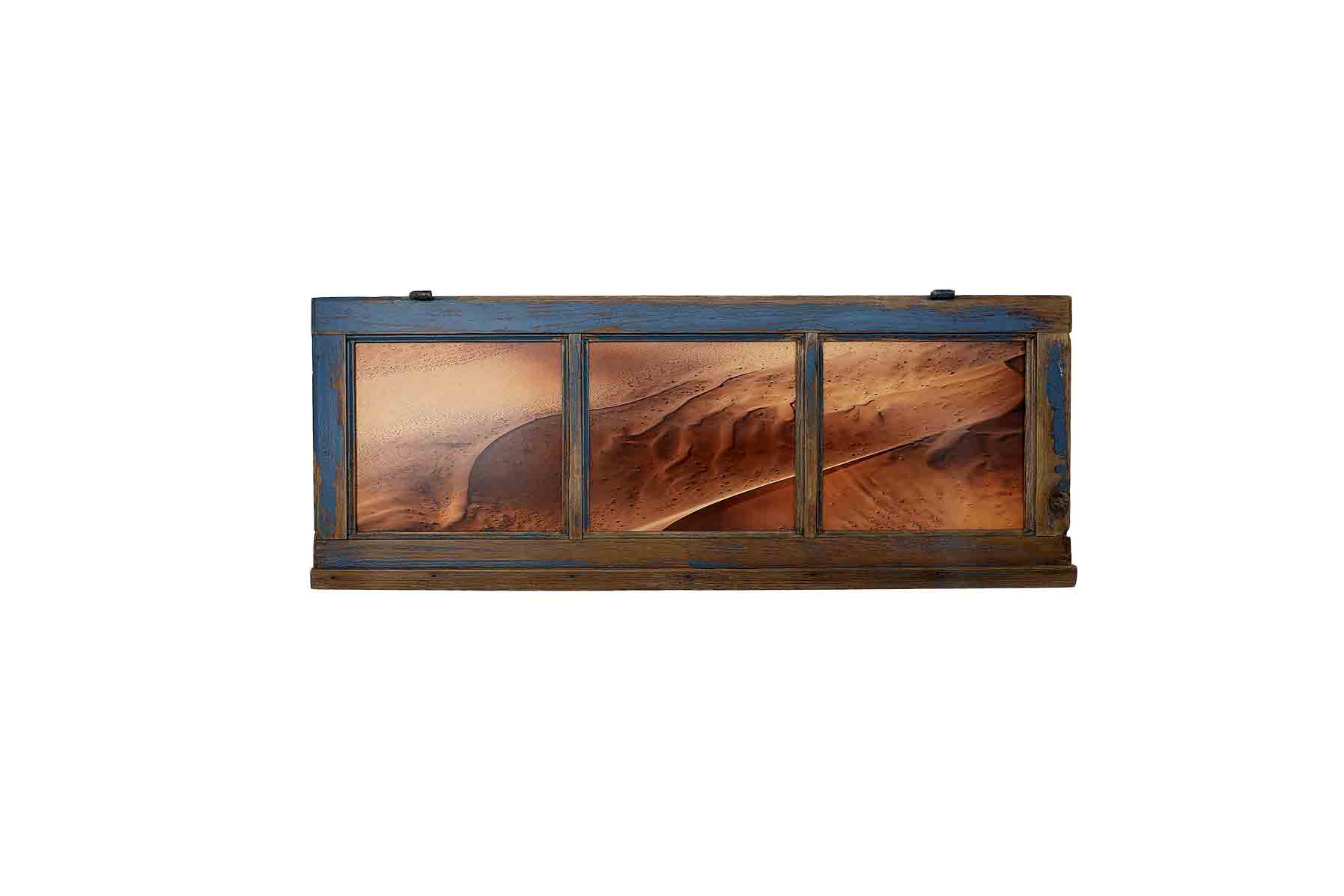 Parte superiore di una foto scattata a Giugno 2024 che rappresenta le dune del deserto del Namib, in Namibia, riprese durante un sorvolo. La foto è stata stampata a settembre 2025 in Fine Art Giclée su carta baritata Prestige 340 gsm e montata in una delle ante di una piccola finestra proveniente da una antica casa dell'isola di Creta. l'opera fa parte di un dittico.