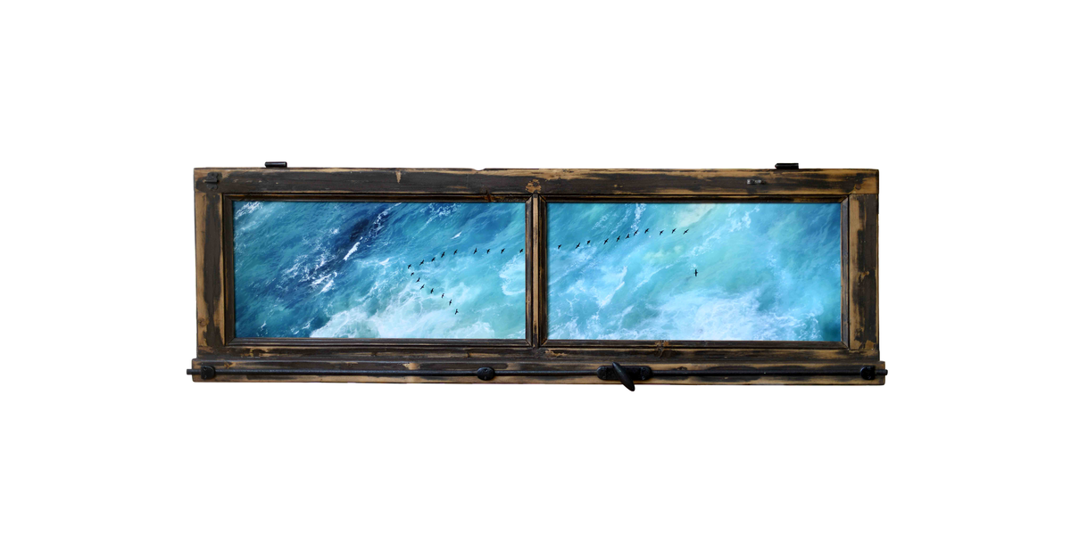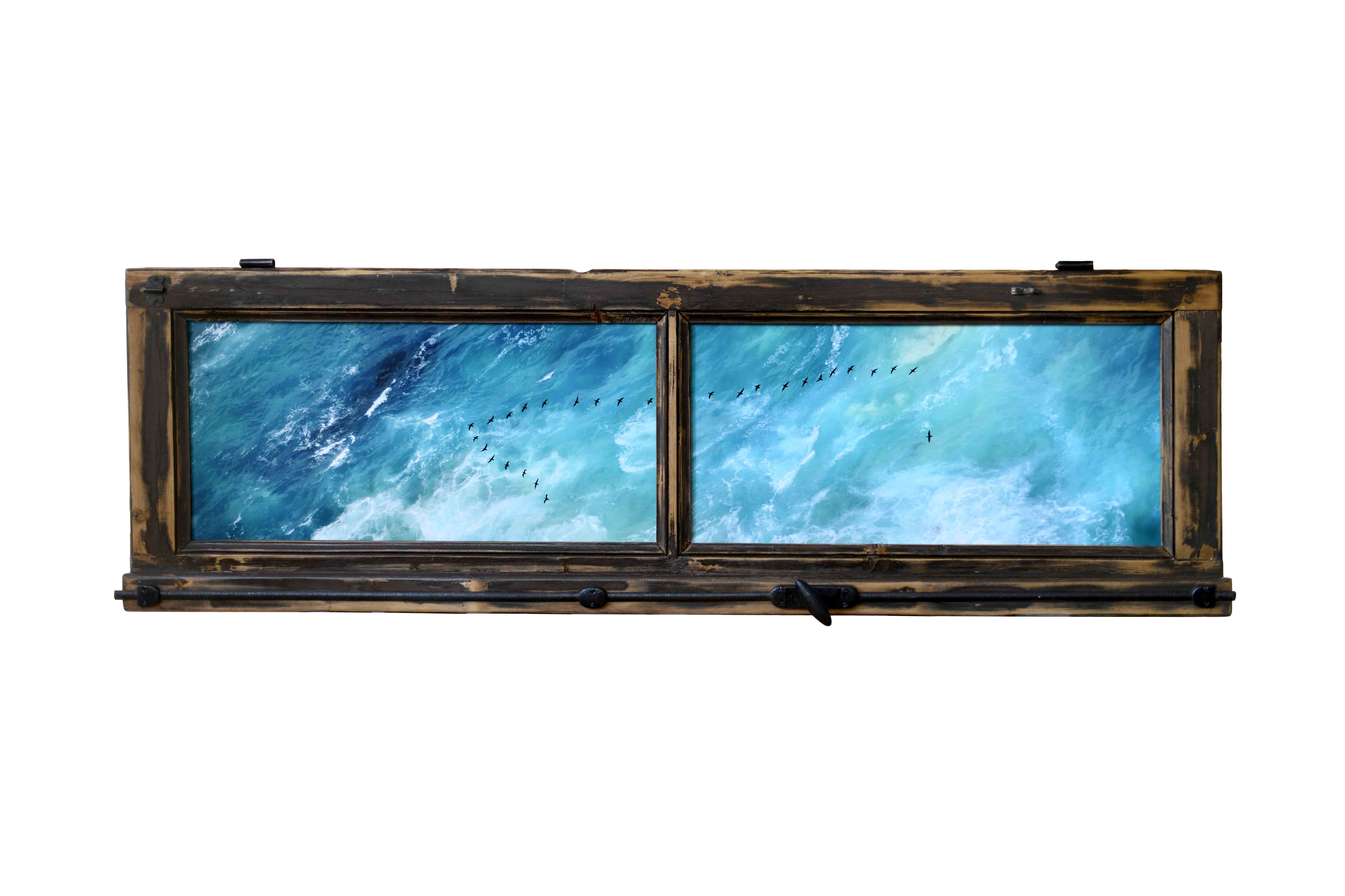 CORVUS MARINUS III - cm 160 x 50 - Cape Point, South Africa 2025 – La foto scattata a Gennaio 2025, rappresenta una formazione a V di Cormorani in volo sopra le acque dell’Oceano Atlantico e dell’Oceano Indiano, che si mescolano al Capo di Buona Speranza in Sudafrica. La foto non è realizzata con l’uso di un drone, ma dall’alto del capo a circa 250 msl. Ad Aprile 2025 l’immagine è stata stampata su carta Hahnemühle FineArt Baryta certificata, 325 gsm, e montata su due pannelli di alluminio Dibond che sono stati inseriti nel telaio di una finestra antica. Accompagnata da Certificato di autenticità di opera unica. Esposto alla Biennale di Genova 2025, è disponibile alla vendita.