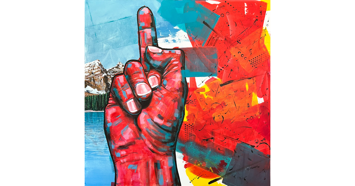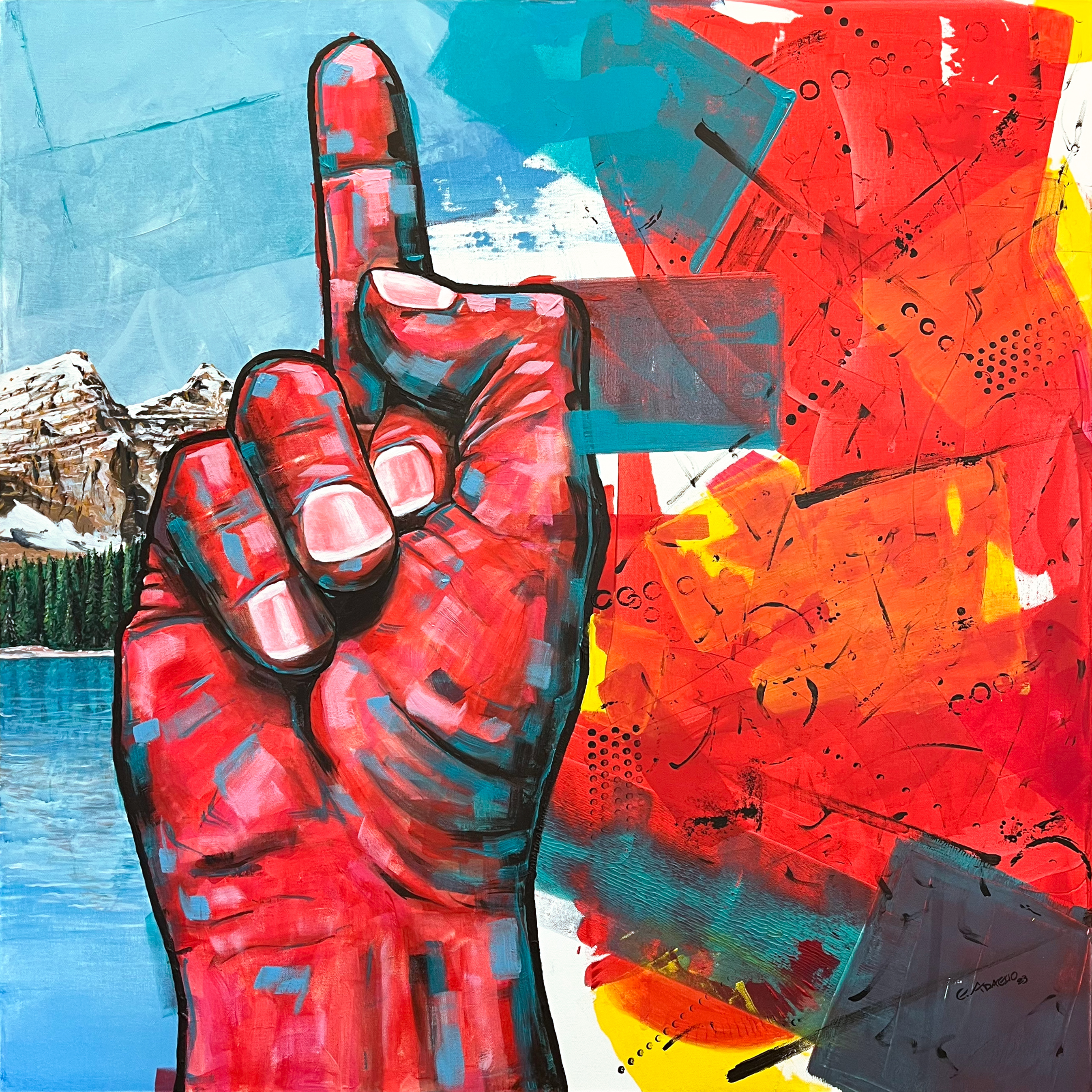 Una mano con il dito medio alzato: è il messaggio che la terra ci sta inviando. Separa quella che è la bellezza del nostro pianeta oggi, uno spazio ormai decisamente ridotto, da un’idea astratta che rappresenta un futuro che non è più nostro, fatto di chiazze di colore che simboleggiano alluvioni e incendi.