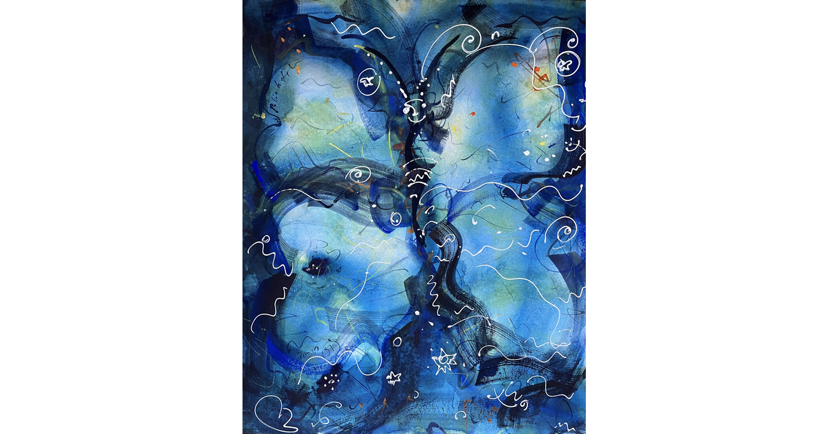 “Farfalla cosmica” è un acquerello in cui una figura alata emerge da un vortice di blu profondi e segni bianchi luminosi, evocando un volo simbolico tra energia, spazio e immaginazione.