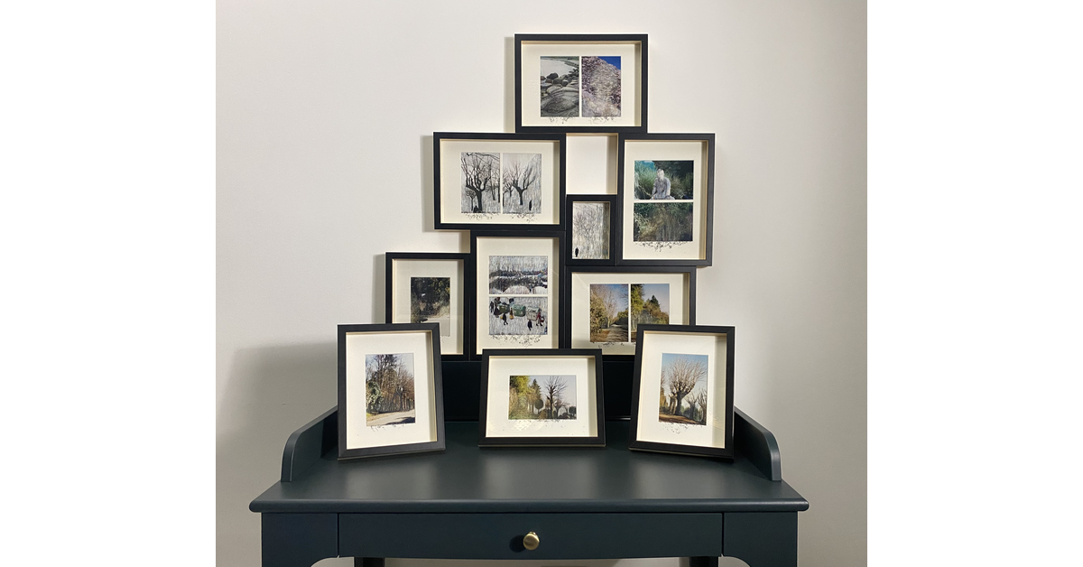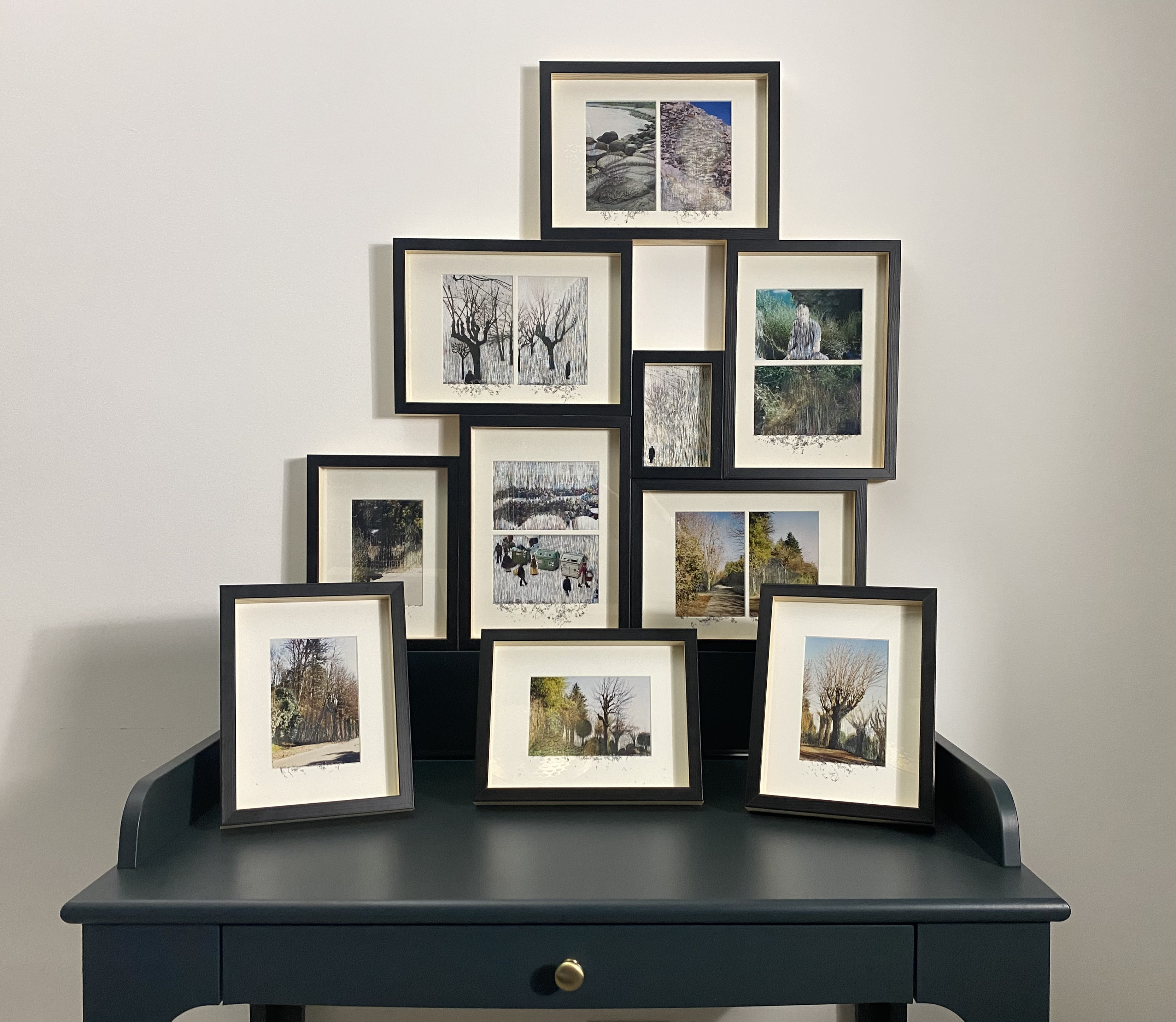 Sometimes these scratches are needed to remove natural elements from the landscape, for the purpose of creating a warning, a suggestion, a feeling of nostalgia caused by the loss; other times the removal concerns barriers and people perceived as intruders: in this case nature on the background is reconstructed and looks like camouflaged thanks to the use of a restoration technique called Rigatino (tight lines takes the place of the original visual elements building new ones). In both the previously quoted cases, a plastic dust remains after engraving, and it is kept in sight in the frames.