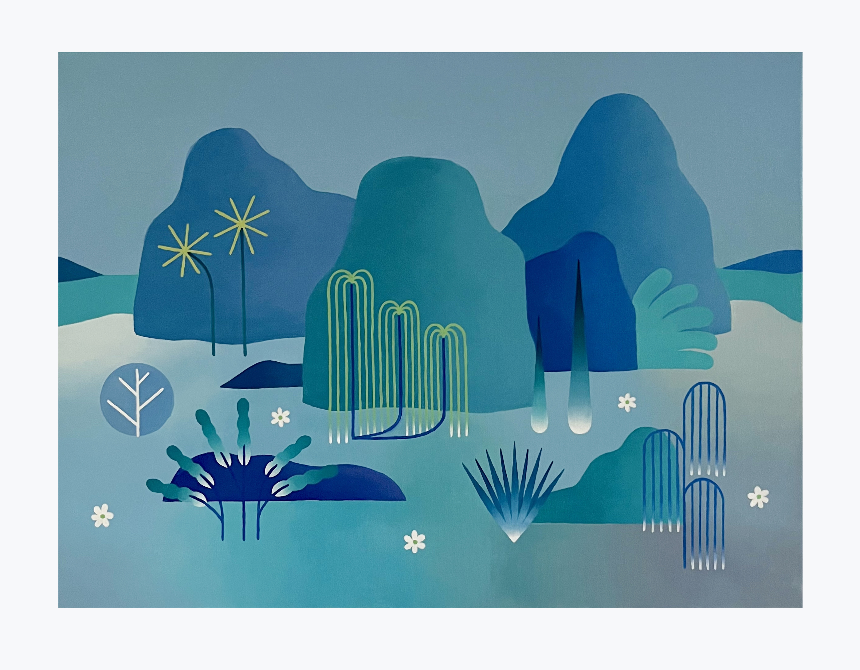 I lavori di Marco Sandreschi (nato nel 1996 a Lucca, vive e lavora a Firenze) uniscono lo stile tipico dell’illustrazione, minimale e stilizzato, con la tradizione della pittura di paesaggio. Fra le ispirazioni ci sono i grandi paesaggisti medievali fiamminghi ed italiani, ma anche artisti più recenti come Prampolini, Pericoli, Steinberg e Salvo. L’intento dell’artista è quello di creare nuovi spazi che abbiano capacità narrativa. In altre parole, Sandreschi vuole realizzare l’idea di un paesaggio che sia lontano dalla realtà, sospeso ed eterno, quasi misterioso. L’osservatore così non si concentra su un solo soggetto ma sulla disposizione di più elementi che tutti insieme dialogano fra loro. Lo spazio quindi non è rappresentato ma usato per creare un ambiente che tiene insieme tutti gli elementi in un policentrismo dove tutti i soggetti hanno la stessa dimensione indipendentemente dalla prospettiva.