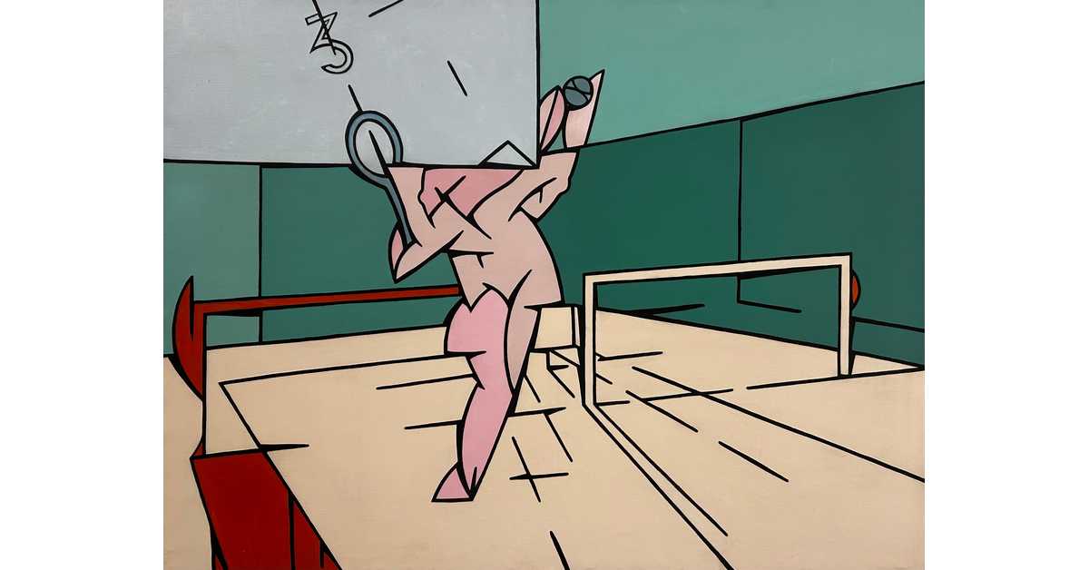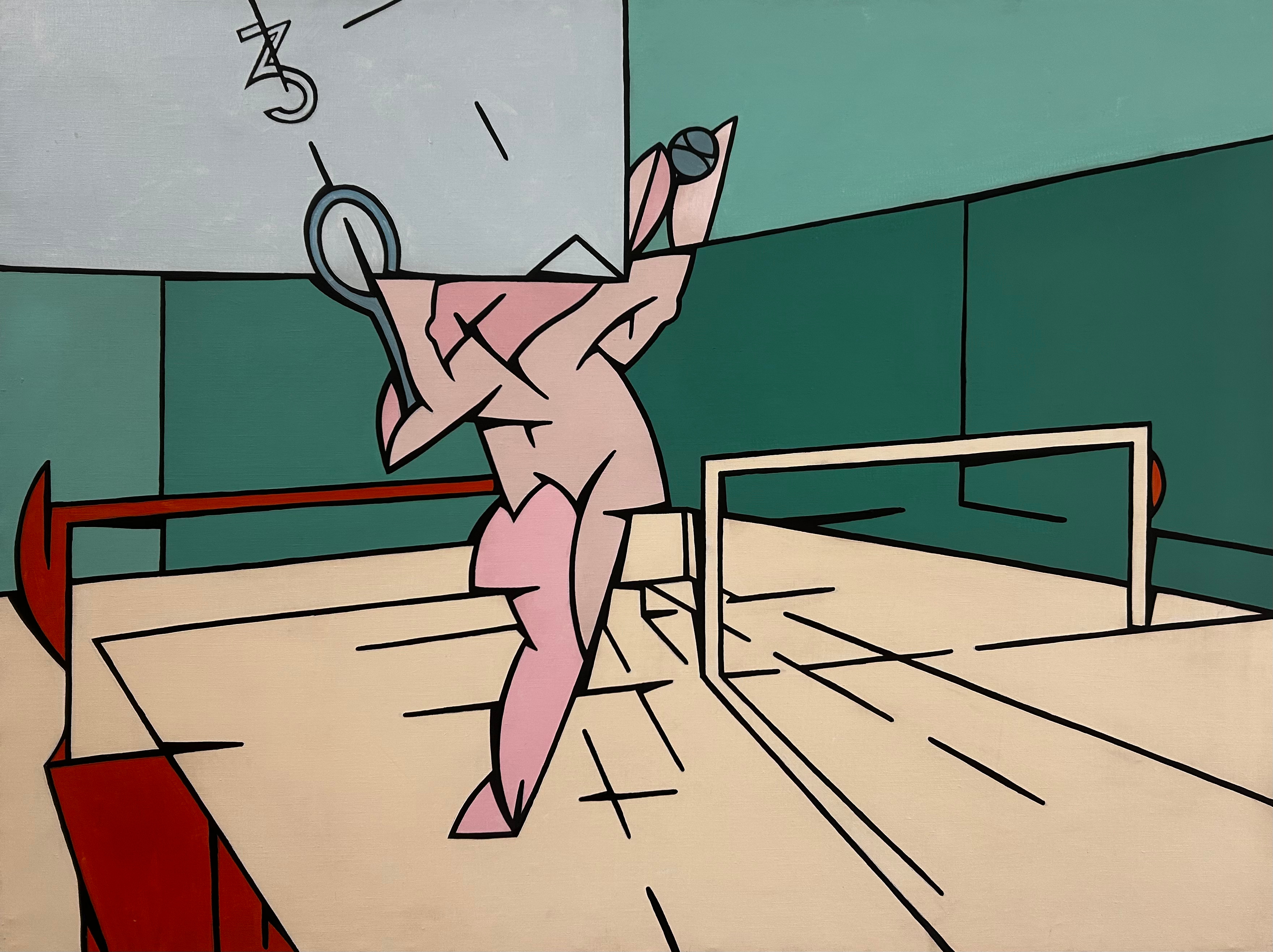 Painted by Valerio Adami in 1967, this work is an emblematic example of the mature pictorial language he developed during the most fruitful period of his career, between the late 1960s and early 1970s. The scene depicts a tennis court, but it is broken down into a geometric and fragmented structure, outlined by sharp contours and uniform fields of colour. The central figure, deformed and segmented, seems to merge with the surrounding space, suggesting a suspended action, almost crystallised in time. Adami's style, halfway between comics, pop art and metaphysical painting, transforms the sporting gesture into a symbolic icon, charged with meanings that go beyond mere representation.