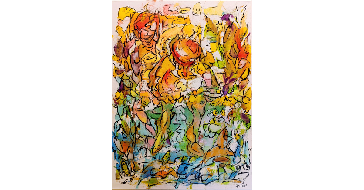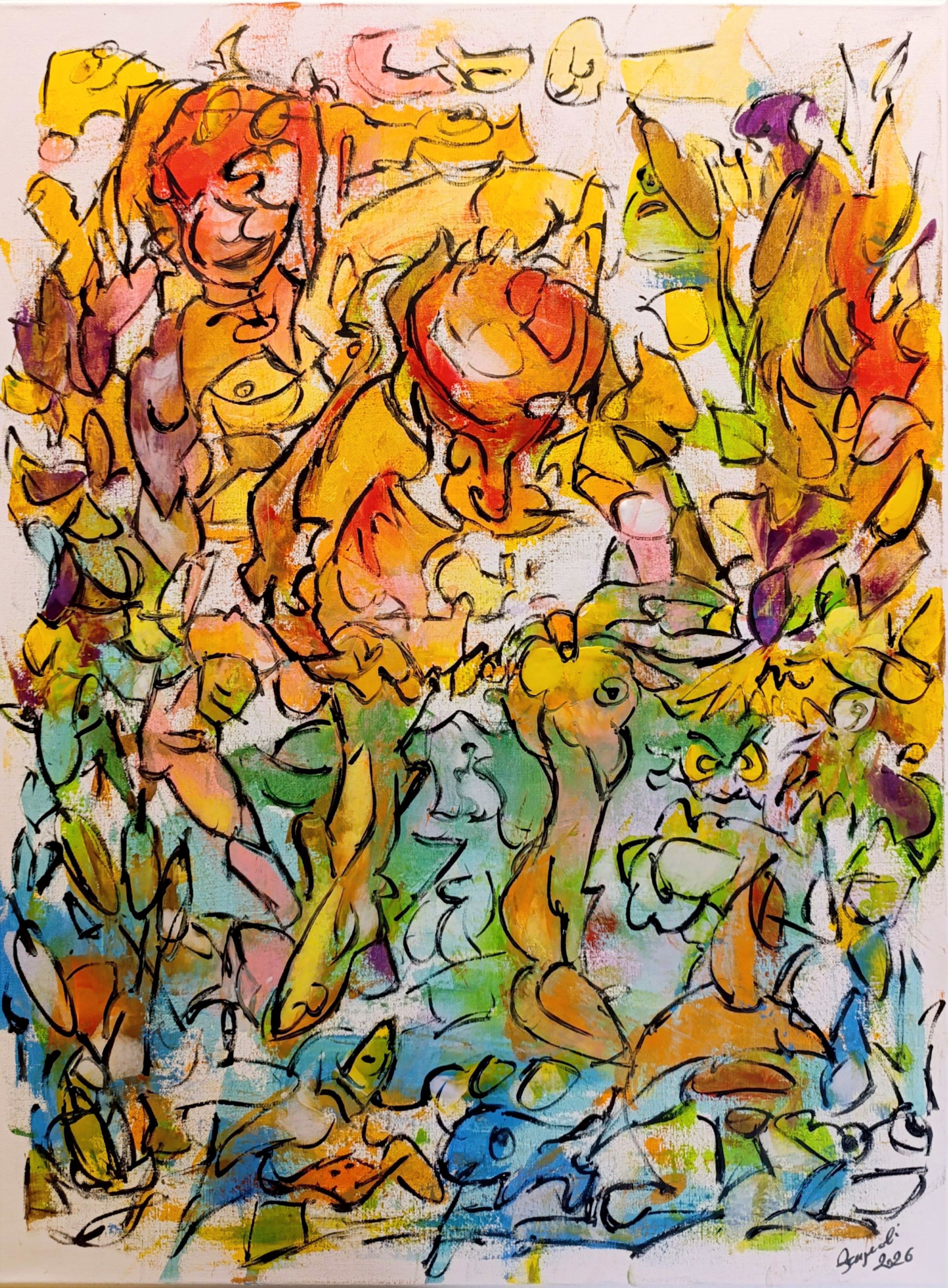 In quest’opera del 2026, Gian Marco Brugnoli ci invita a immergerci in un ecosistema visivo dove il confine tra astrazione e figurazione si dissolve completamente. Il dipinto si manifesta come una "danza primordiale": un groviglio vibrante di linee nere, nervose e istintive, che tessono la trama di un racconto onirico in perenne divenire.