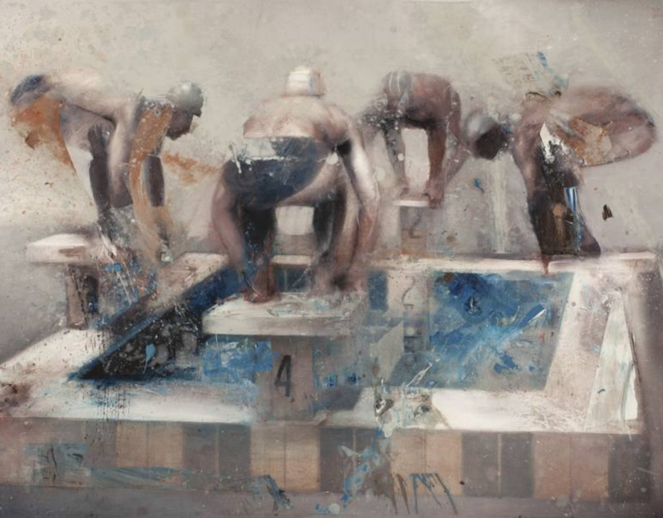 I “Nuotatori” sono un tema ricorrente nell’opera di Nicola Pucci e rappresentano molto più di semplici figure sportive. Nei suoi dipinti i corpi immersi nell’acqua appaiono sospesi, come bloccati in un attimo che sembra durare all’infinito, trasformando il gesto del nuotare in qualcosa di simbolico. L’acqua diventa uno spazio mentale oltre che fisico, un luogo di incertezza e profondità in cui i personaggi sembrano cercare equilibrio o superare un limite personale. Attraverso questa immagine, Pucci racconta la condizione umana, fatta di sforzo, isolamento e continua tensione verso qualcosa che spesso resta indefinito.