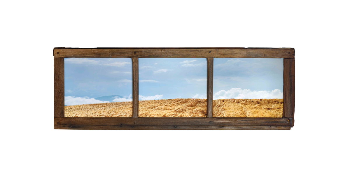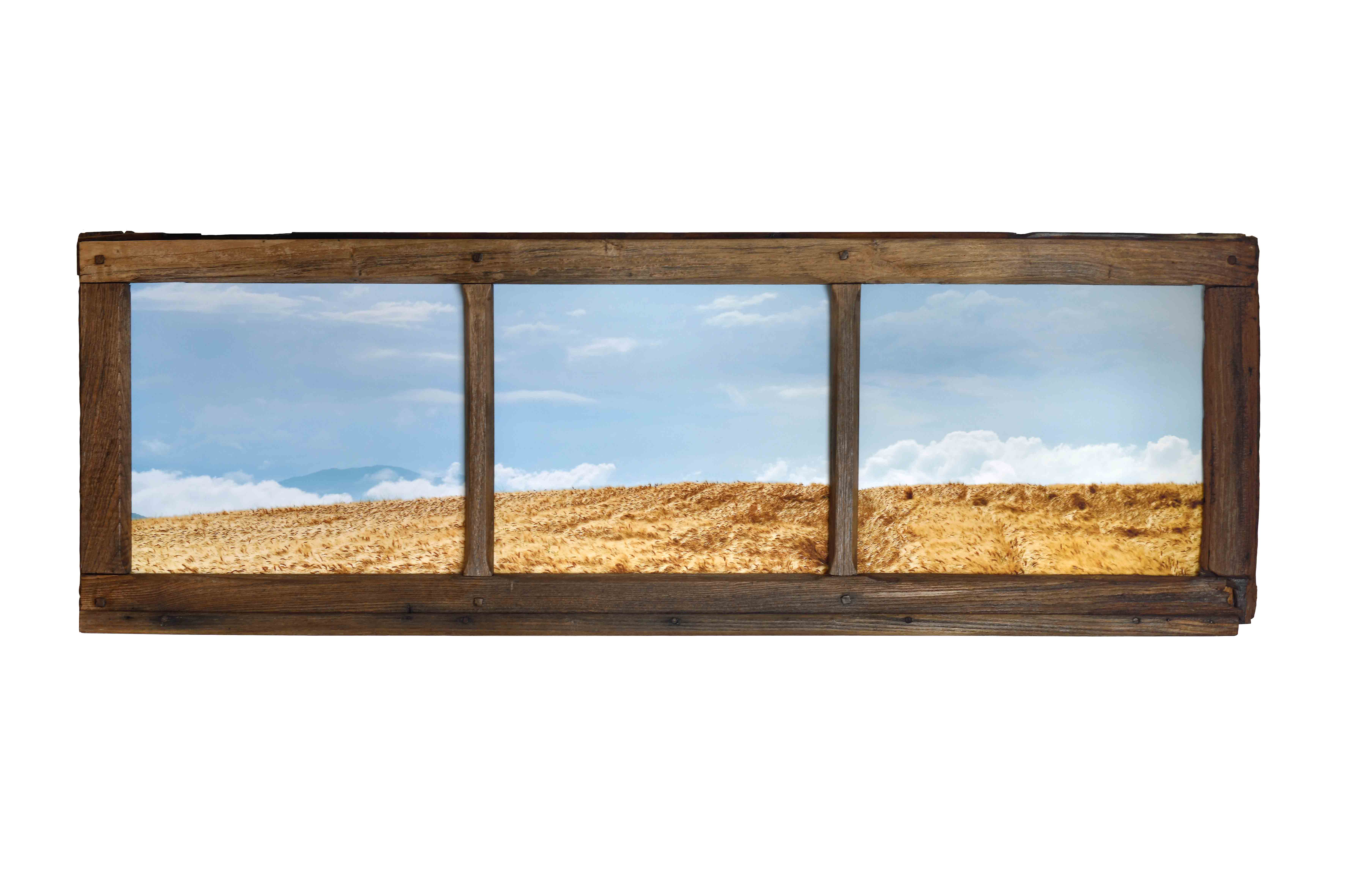This photo, taken in June 2023, represents the wheat field of the Convento district in the municipality of San Martino in Pensilis, in Molise, Italy. In December 2023 it was printed with Fine Art in three Alubond panels measuring 43.5 x 37.5 cm, on Photo Rug paper, Hahnemule Bright White 100% Cotton, 310 gsm. Mounted inside a wooden window sash of an old factory at north of Caserta.
