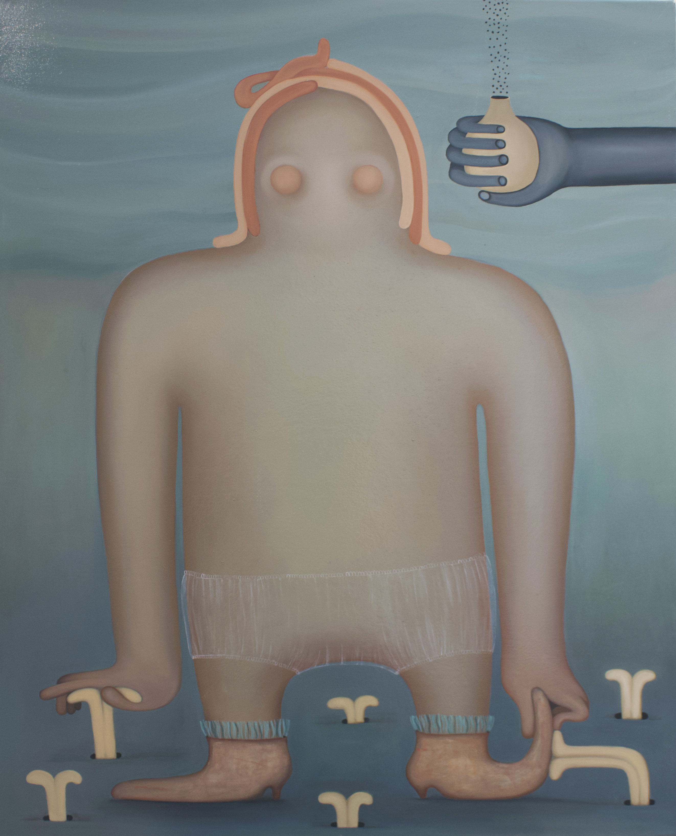 Her paintings evoke strangeness, humor, and unease, inviting viewers to question meaning and symbolism. Through smooth lines and soft color compositions, she crafts images that feel both familiar and mysterious, challenging perception and redefining human representation.