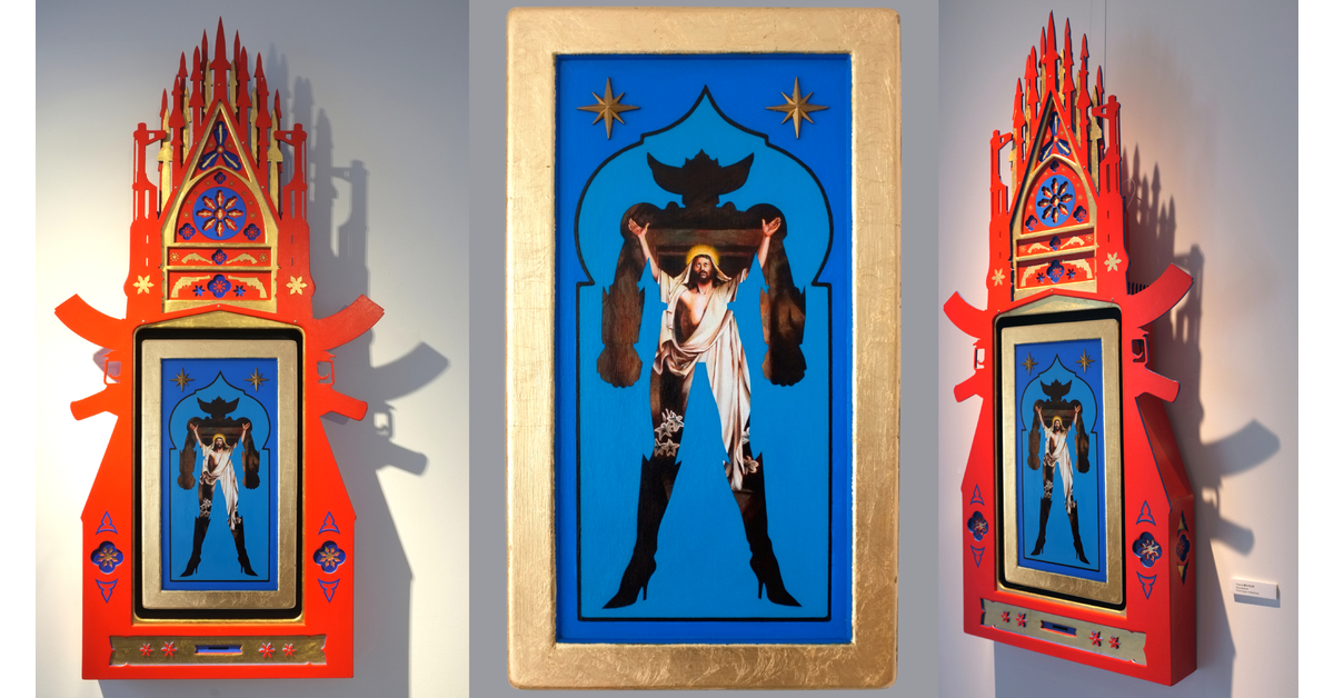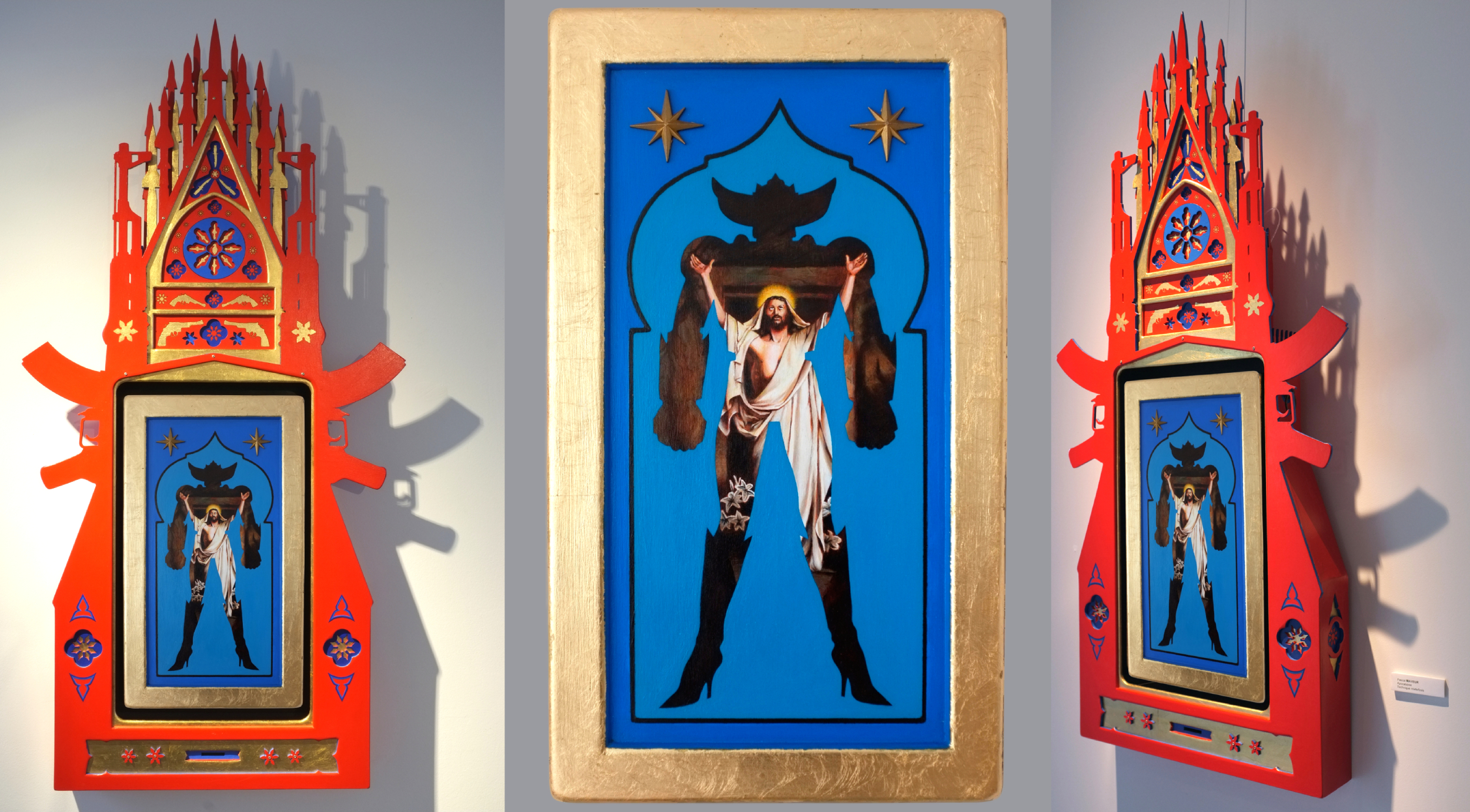 An acrylic reproduction of Carl Bloch's "The Resurrection of Christ" is created with relative fidelity. The robotic profile of the body is clearly influenced by the iconography of Japanese pop culture. The support is a 1.5 cm thick multiplex beech wood panel, whose moldings are covered with gold leaf. A Chinese-style hardware hook is fixed to the back for hanging. Dimensions: 50 x 30 cm.