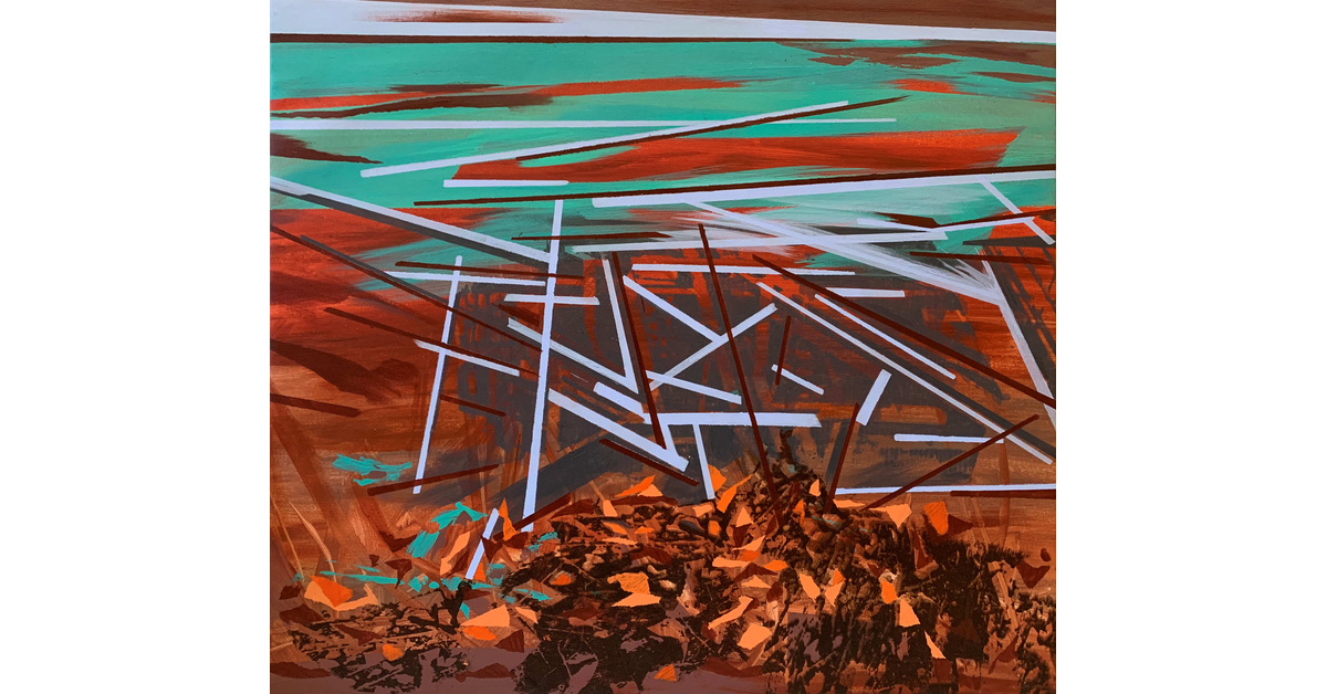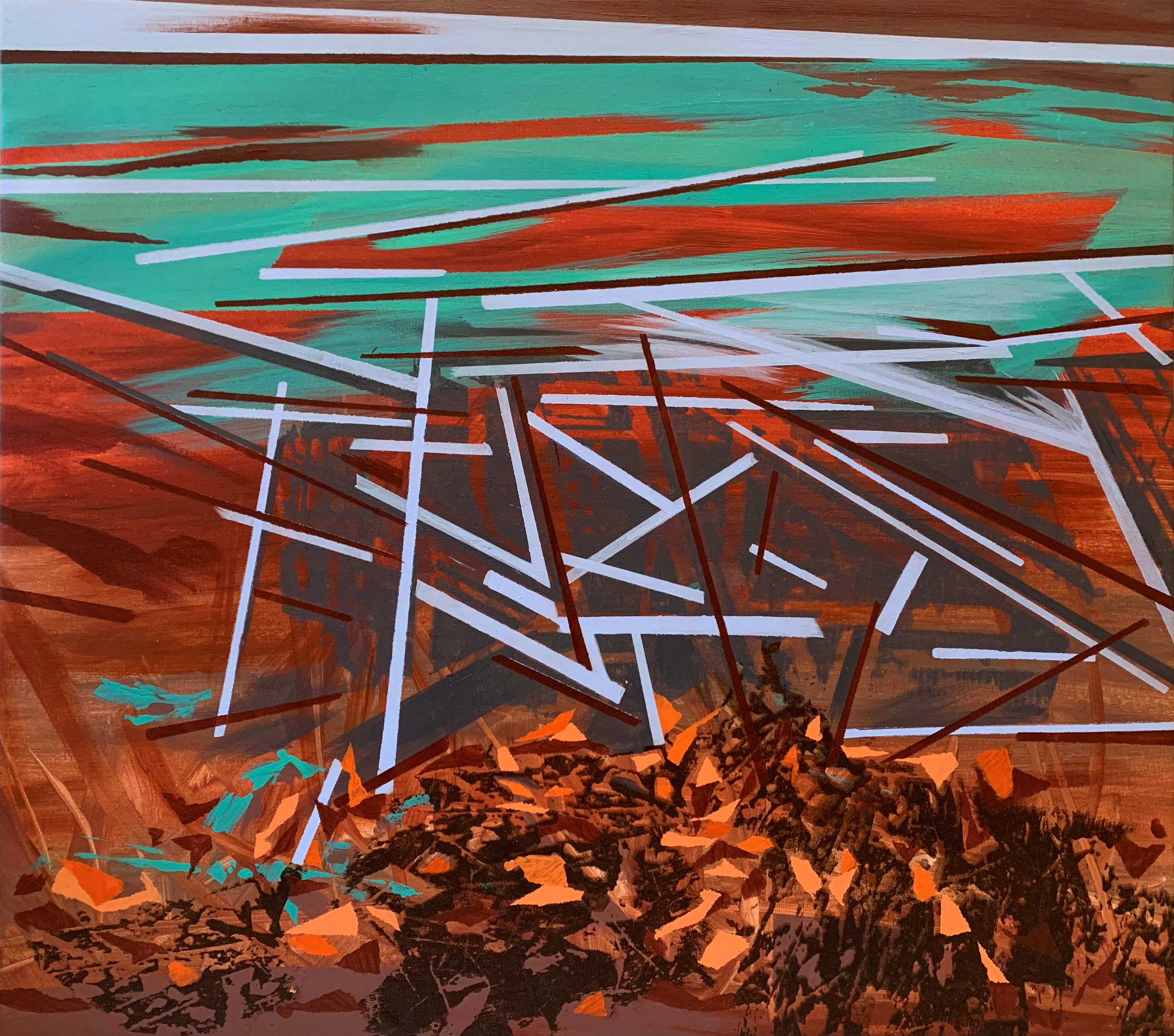 Sulla superficie pittorica fatta di velature, gesti, linee e stratificazioni prende forma l’immagine di paesaggi felici e inquietanti al tempo stesso. In equilibrio tra naturale e artificiale, la verticalità di architetture minacciose fa da sfondo ad una vegetazione simbolo di forza generatrice.