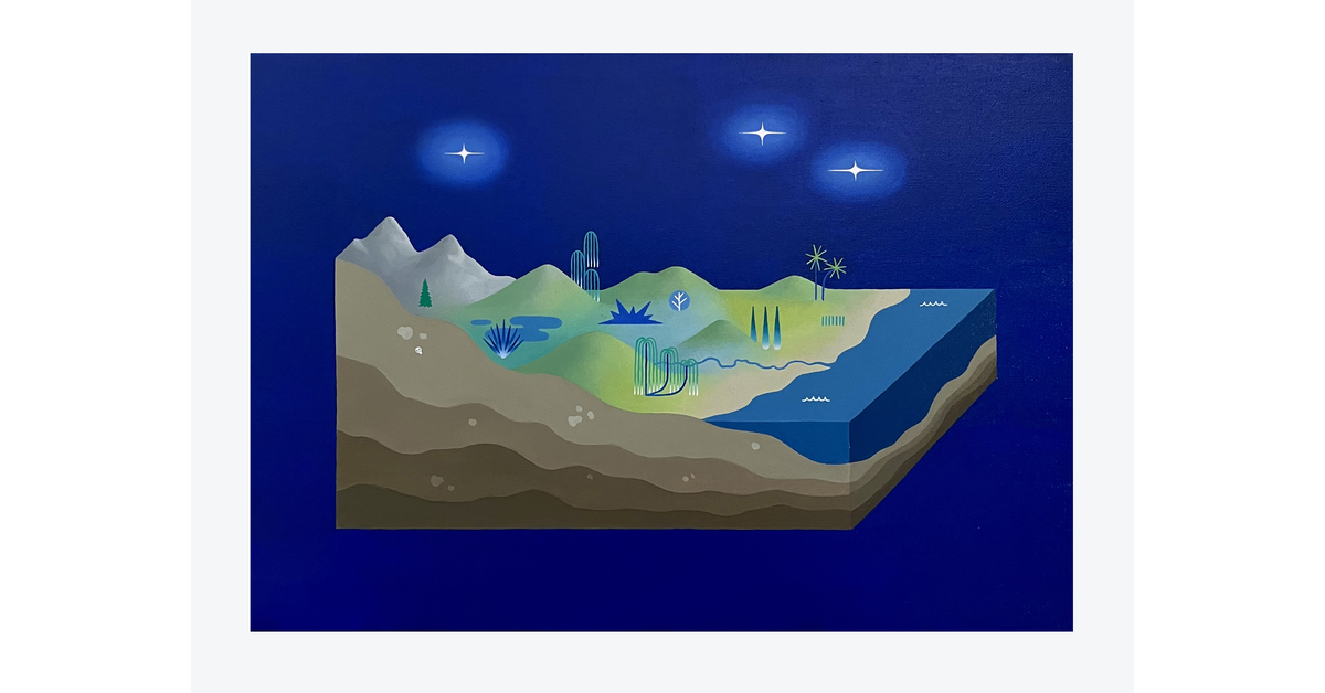 I lavori di Marco Sandreschi (nato nel 1996 a Lucca, vive e lavora a Firenze) uniscono lo stile tipico dell’illustrazione, minimale e stilizzato, con la tradizione della pittura di paesaggio. Fra le ispirazioni ci sono i grandi paesaggisti medievali fiamminghi ed italiani, ma anche artisti più recenti come Prampolini, Pericoli, Steinberg e Salvo. L’intento dell’artista è quello di creare nuovi spazi che abbiano capacità narrativa. In altre parole, Sandreschi vuole realizzare l’idea di un paesaggio che sia lontano dalla realtà, sospeso ed eterno, quasi misterioso. L’osservatore così non si concentra su un solo soggetto ma sulla disposizione di più elementi che tutti insieme dialogano fra loro. Lo spazio quindi non è rappresentato ma usato per creare un ambiente che tiene insieme tutti gli elementi in un policentrismo dove tutti i soggetti hanno la stessa dimensione indipendentemente dalla prospettiva.