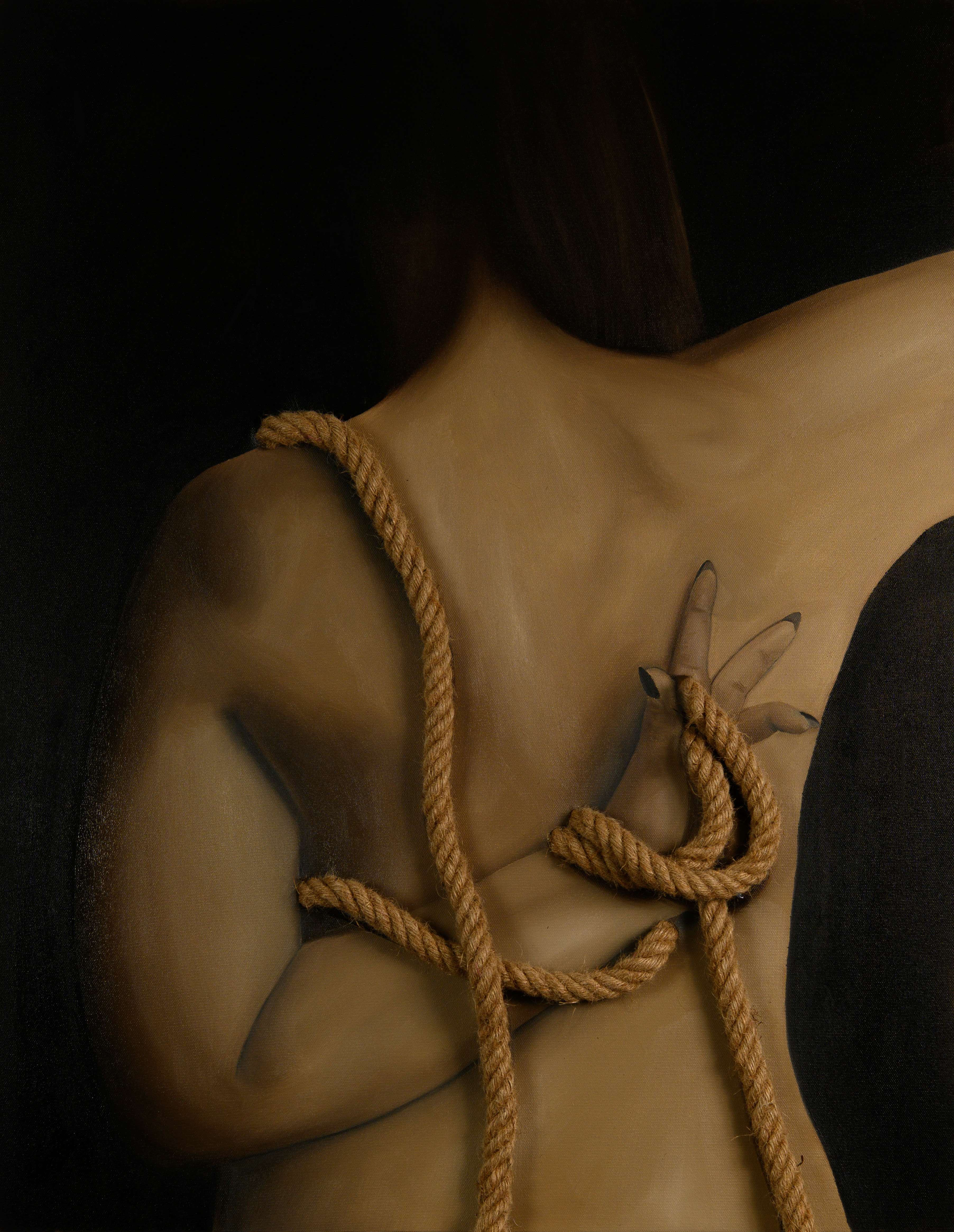 L’immagine si fa più intima, più cruda. L’artista si mostra di spalle, nuda fino alla vita, vulnerabile ma mai sottomessa. La corda di juta, che ora afferra da dietro, si insinua come un peso antico e radicato, stretto nella carne, nell’identità, nella memoria del corpo.