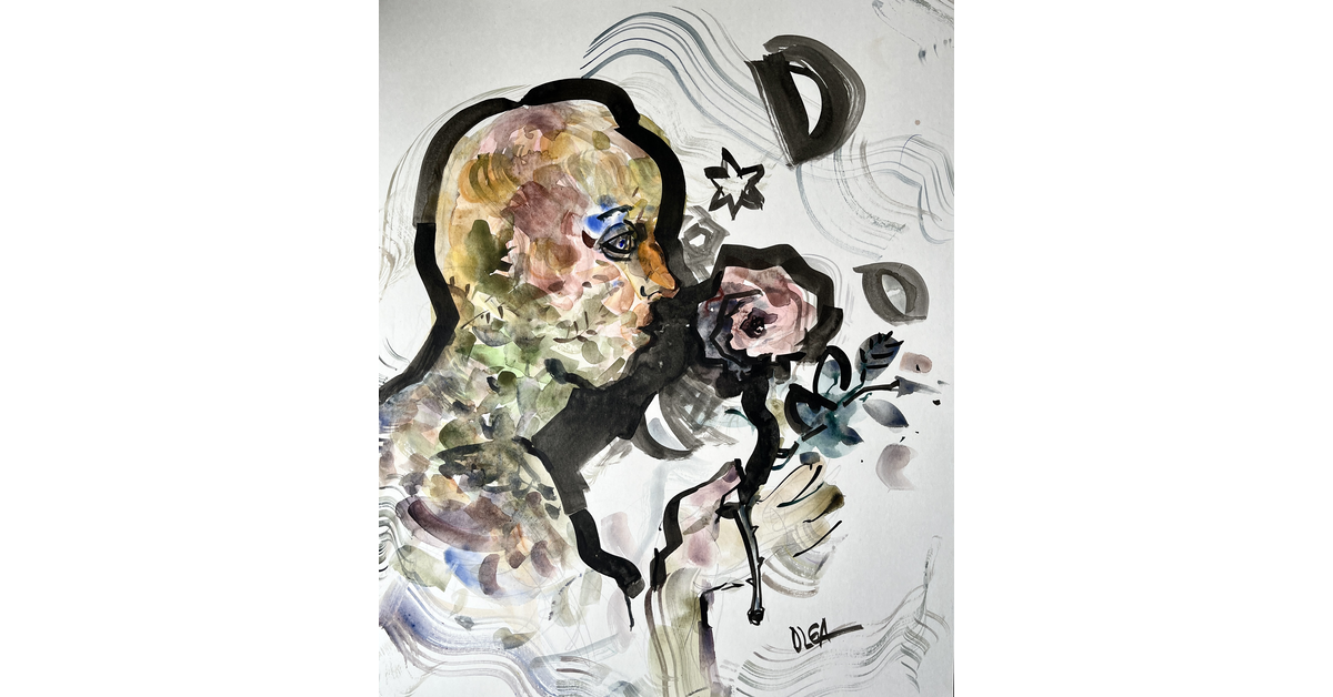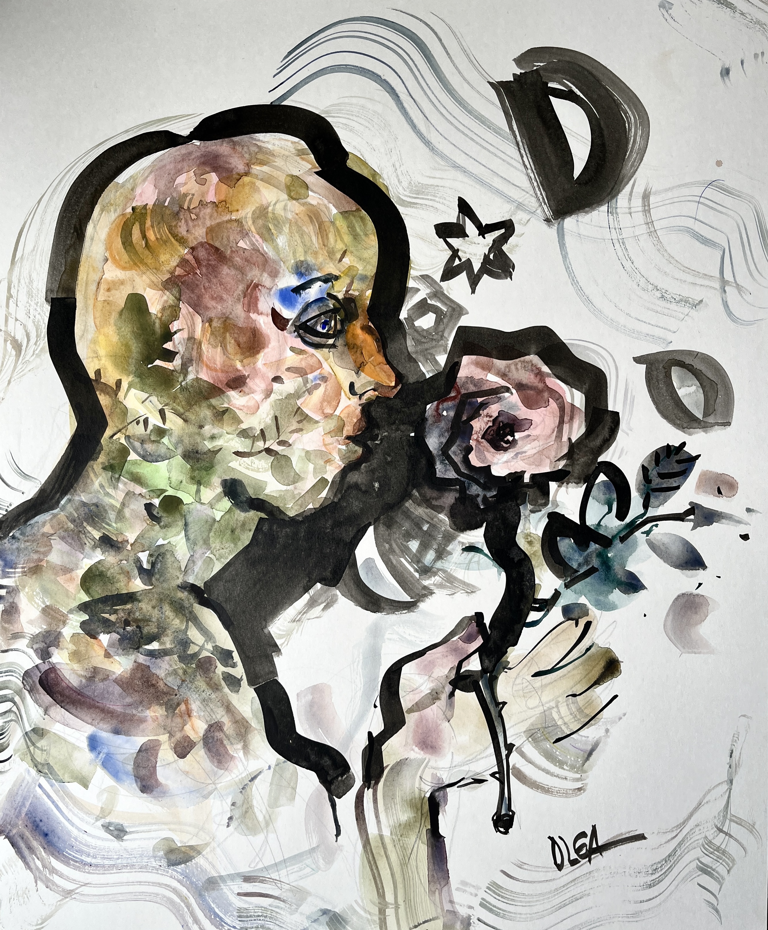 In questa opera, cerco di dare la forma a una figura che sembra emergere da un territorio interiore in continua trasformazione. Il volto, attraversato da campi di colore fluidi e stratificati, custodisce uno sguardo che non osserva il mondo, ma lo immagina. La creatura tiene tra le dita un fiore sospeso, fragile e cosmico allo stesso tempo: un gesto che diventa rito, un’offerta, un passaggio.